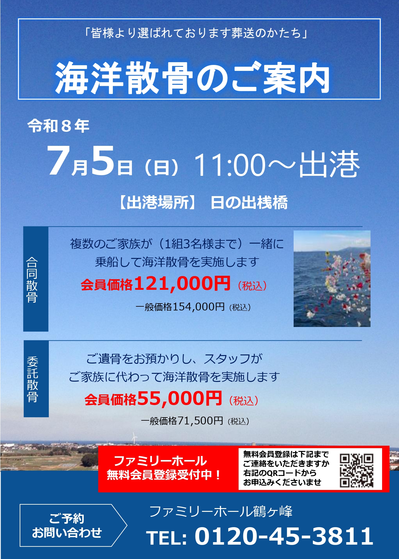 ファミリーホールでは、令和8年7月5日(日)11:00より、日の出桟橋から出港する海洋散骨を実施いたします。今回の東京出港散骨では、合同散骨と委託散骨の2つのプランをご用意しております。