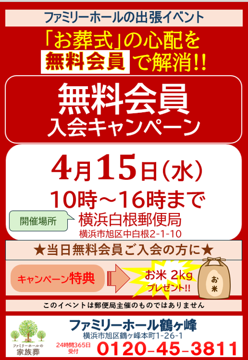 ファミリーホール鶴ヶ峰では、4月15日(水)10時~16時横浜白根郵便局にて出張イベントを開催いたします。